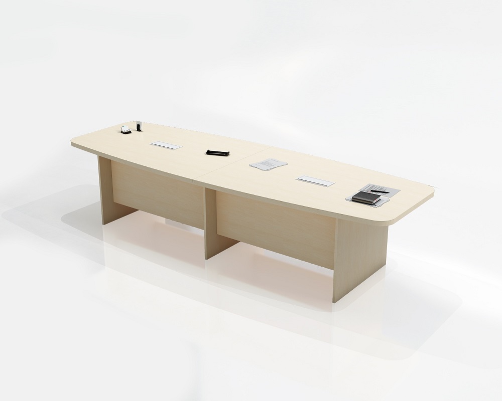 Integrated Technology: The table is equipped with integrated technology solutions to support various types of meetings and collaborations. This might include built-in power outlets, USB charging ports, wireless charging pads, HDMI and USB-C ports for connecting laptops and mobile devices, and possibly even built-in displays or projectors.